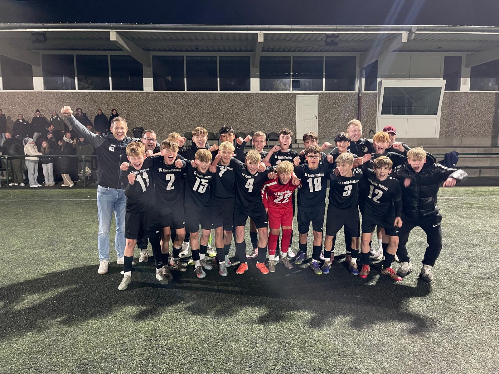 Mit einem 3:0 Heimsieg gegen die JSG Lohne/Wietmarschen I einen Spieltag vor Schluss der Hinrunde sichert sich die U15 des SCSV am Donnerstagabend frühzeitig die Meisterschaft in der Qualifikationsgruppe 4 der Bezirksliga Weser-Ems III. Aufgrund des in dieser Saison neu eingeführten Spielmodus steigt die Mannschaft bereits zur Rückrunde der Saison 25/26 in die Landesliga Weser-Ems auf. Die neu formierte Mannschaft rund um das neue Trainerteam bleibt bis zum vorletzten Spieltag in der Liga ungeschlagen und setzte sich gegen starke Konkurrenten der JSG Leschede/Emsbüren/Listrup I und SV Eintracht Nordhorn I spielerisch und kämpferisch durch. Nun heißt es in der Winterpause sich auf die neue Aufgabe in der Landesliga vorzubereiten um die neue Spielklasse zu halten. Die Vorfreunde auf die neue Herausforderung ist bei der Mannschaft und dem Trainer- und Betreuerteam riesengroß.