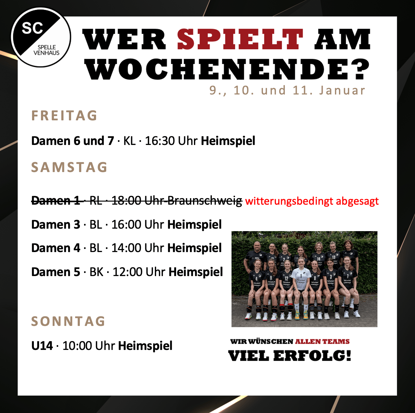Wer spielt am Wochende? Das Spiel der Damen 1 musste witterungsbedingt abgesagt werden. Kommt aber vorbei und unterstützt unsere Mannschaften in Spelle! 🤍🖤
