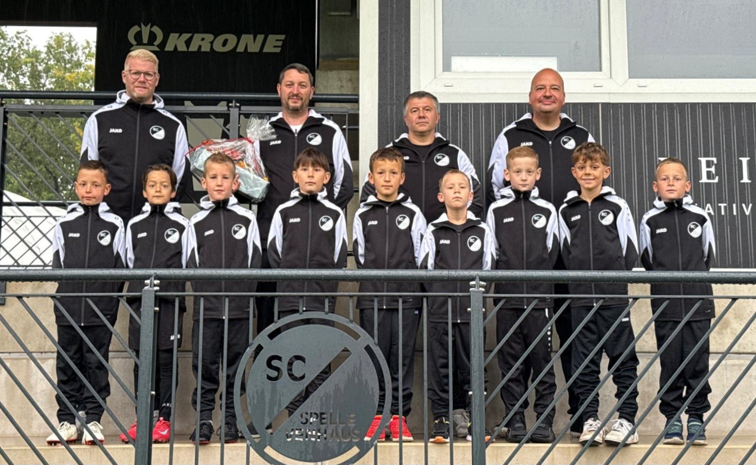Die Trainer der F1 des SC Spelle-Venhaus - Waldemar Subenko, Simon Borgel und Marco Spahn - sowie die gesamte Mannschaft freuen sich über neue Trainingsanzüge.