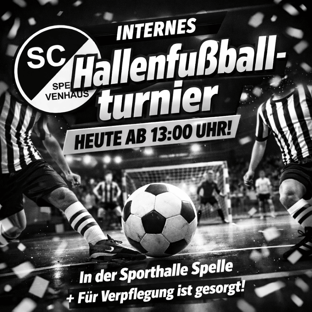 Heute, 27.12.25, findet das diesjährige Hallenfußballturnier unserer Fußballabteilung statt. Start ist um 13:00 Uhr in der Speller Sporthalle. Die Siegerehrung wird gegen 18:30 Uhr stattfinden.