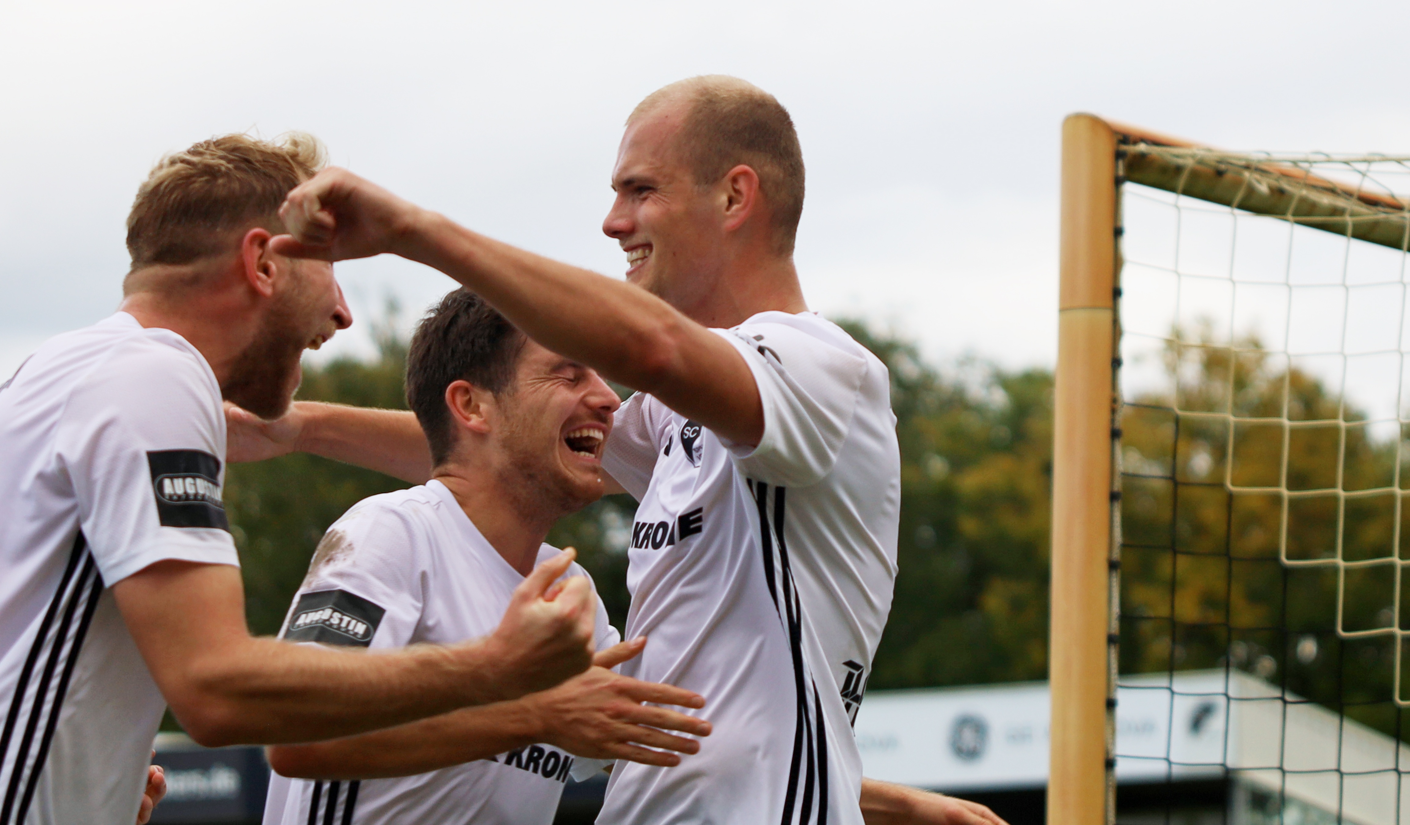 Zum Foto: Mit Torjäger Tom Winnemöller (r.) jubeln Jan-Hubert Elpermann (l.) und Marvin Kehl.