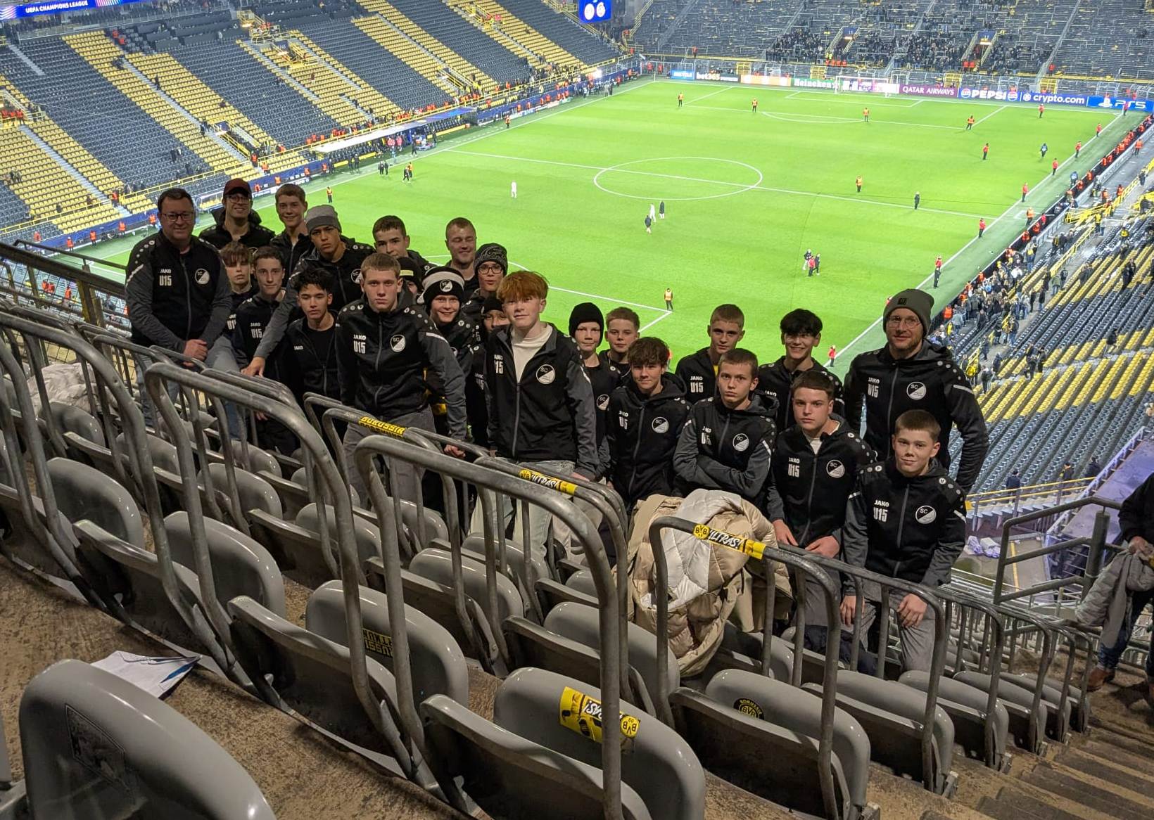 Zum Jahresabschluss wartete auf die U15 des SCSV nochmal ein echtes Highlight. Nach der bereits errungenen Meisterschaft und dem damit verbundenen Aufstieg in die Landesliga machte sich am gestrigen Mittwochnachmittag die Mannschaft zusammen mit dem Trainer- und Betreuerteam sowie mehreren Elternteilen auf den Weg nach Dortmund zum Champions-League Spiel gegen den norwegischen Vertreter Bodø/Glimt. Dieses wurde durch den unermüdlichen Einsatz von Trainer Niklas Schoppe erst möglich, der die Eintrittskarten für alle Beteiligten samt Busfahrt organisierte. Die Größe und Atmosphäre des ausverkauften Signal-Iduna-Parks in Dortmund wird allen noch lange in Erinnerung bleiben.