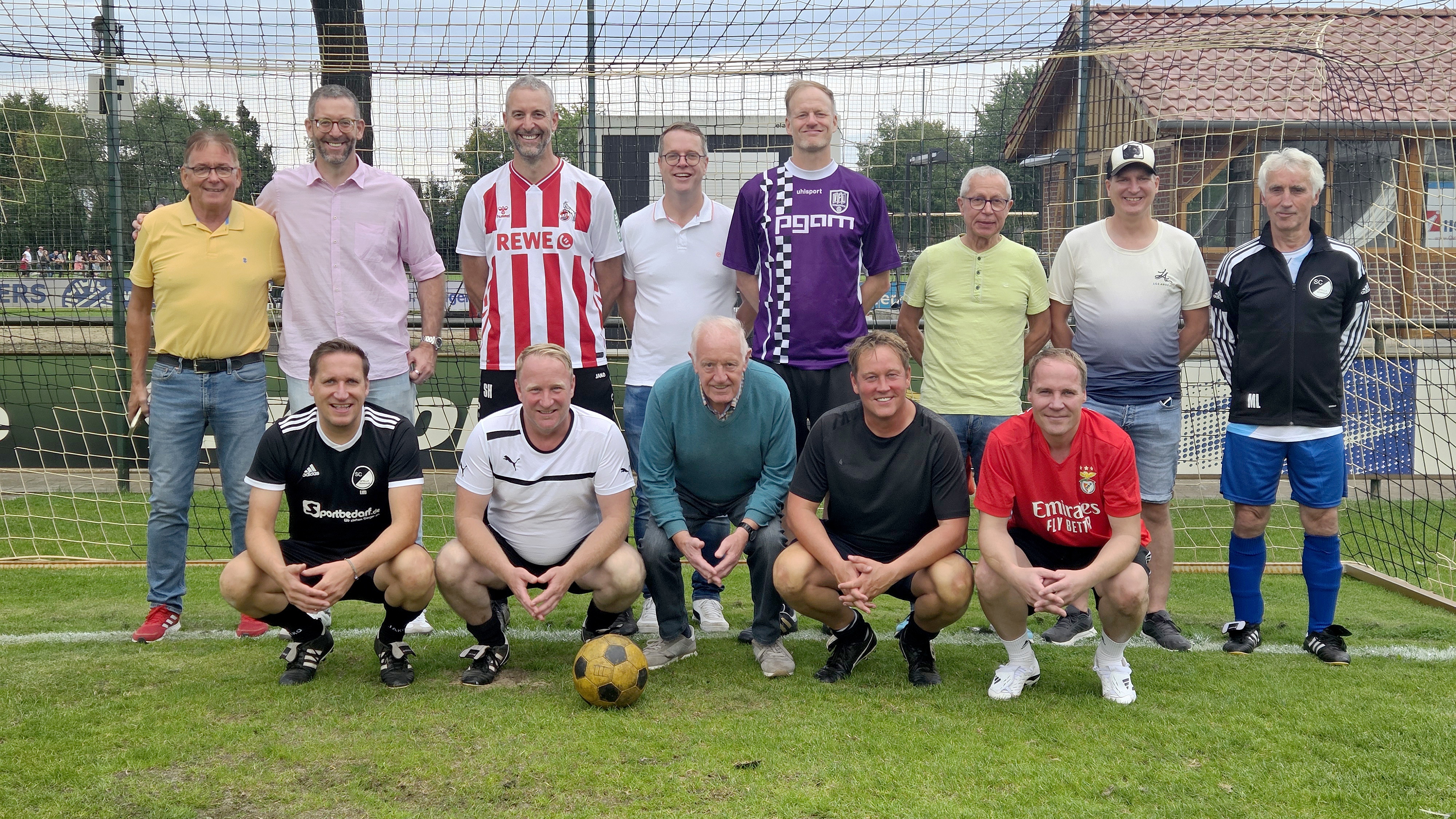 - Alle ehemaligen A-Jugendlichen im Getränke Hoffmann Stadion mit eingeklinktem Foto von Herrmann Börger.